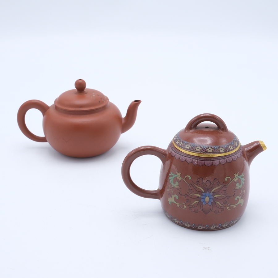 Lot van twee 20e eeuwse Chinese yixing theepotjes. Beide gemerkt, één geglazuurd en met beschildering