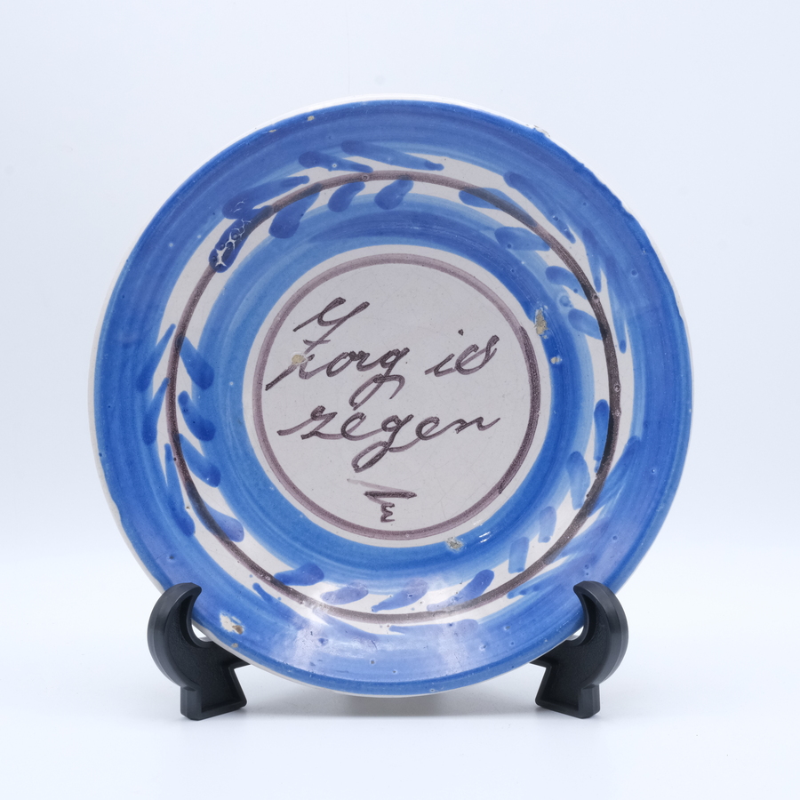 Een antiek 19e eeuws Lemster aardewerken spreukbordje met tekst 'Zorg is zegen'