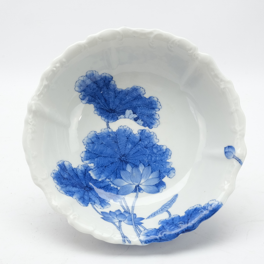 Een 20e eeuwse Japanse porseleinen schaal gedecoreerd met bladermotieven. Op de onderzijde gemerkt 'Kato Gosuke'