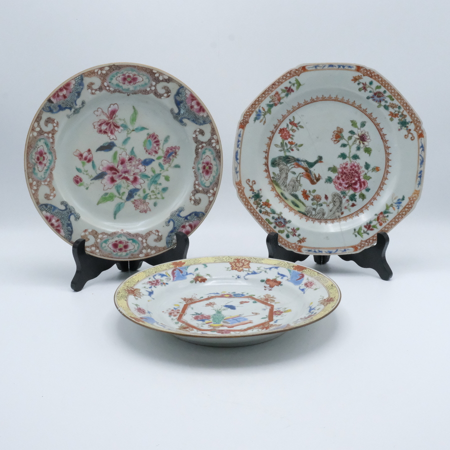 Drie 18e eeuwse famille verte Chinees porseleinen schotels. Diverse florale randen en decors van kostbaarheden, pauwen en pioenrozen op het plat.