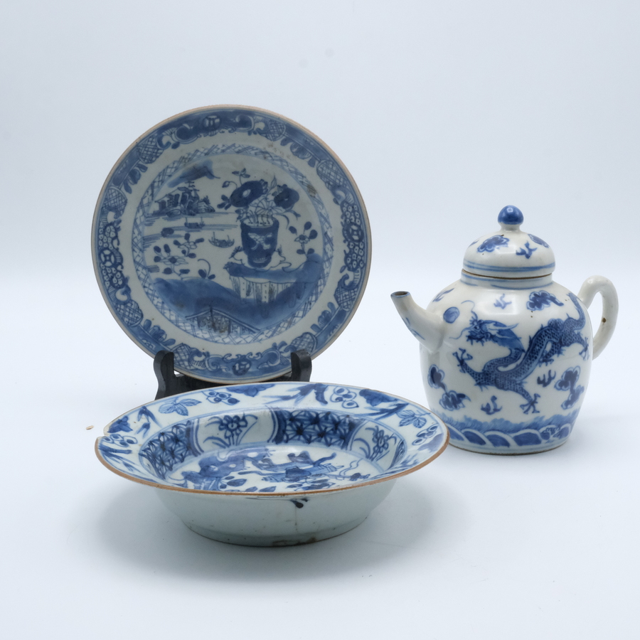 Een Chinees 19e eeuws porseleinen trekpotje. Blauw/wit met decor van draken. Hierbij een 18e eeuws roombordje en schoteltje. Blauw/wit met florale decors.