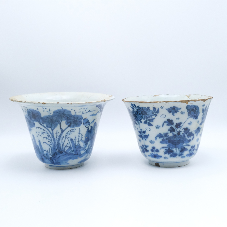 Twee Delfts 18e eeuwse aardewerken bloempotten. Beide met Chinoiserie decors. Één met bloemen rondom en één met rustende lijzen in de tuin.
