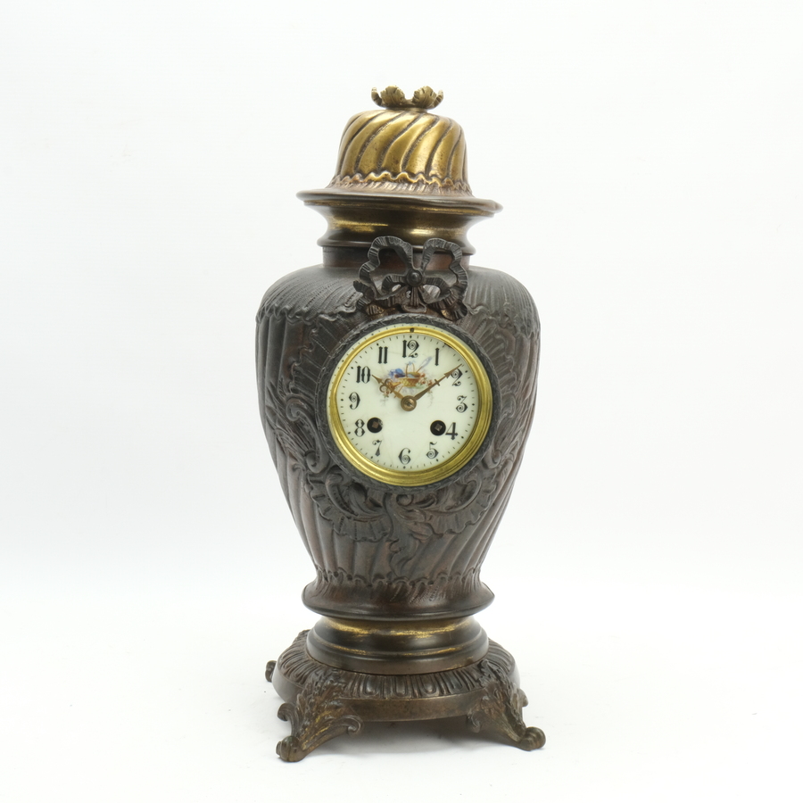 Een antieke Franse metalen vaasvormige pendule met emaille wijazerplaat, bekroond met strikmotief