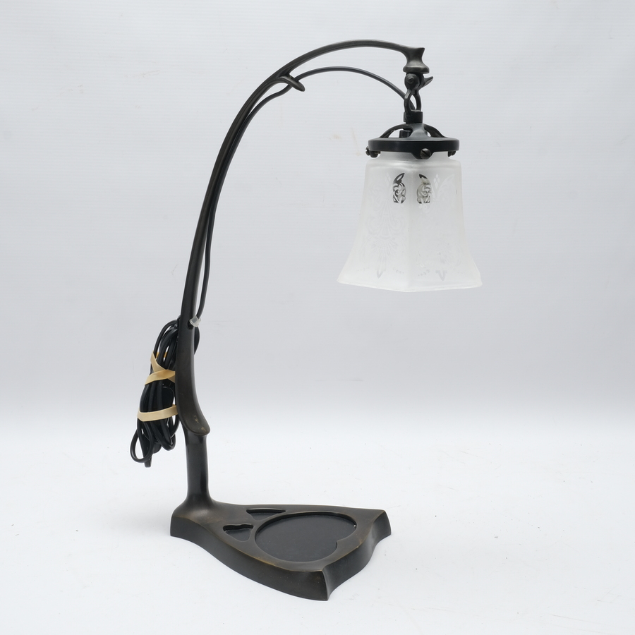 Een 20e eeuwse bronzen lamp in art nouveau stijl met gedeeltelijk glazen zeskantige kantje