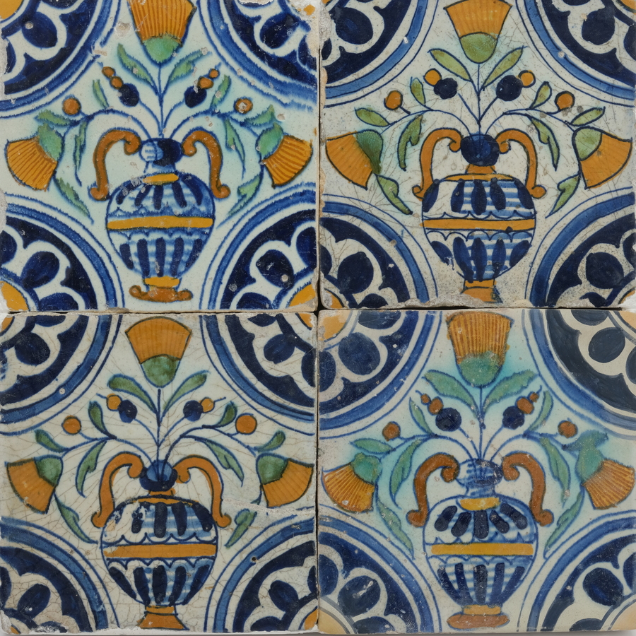 Vier antieke 17e eeuwse tegels, polychroom decor van bloempotten