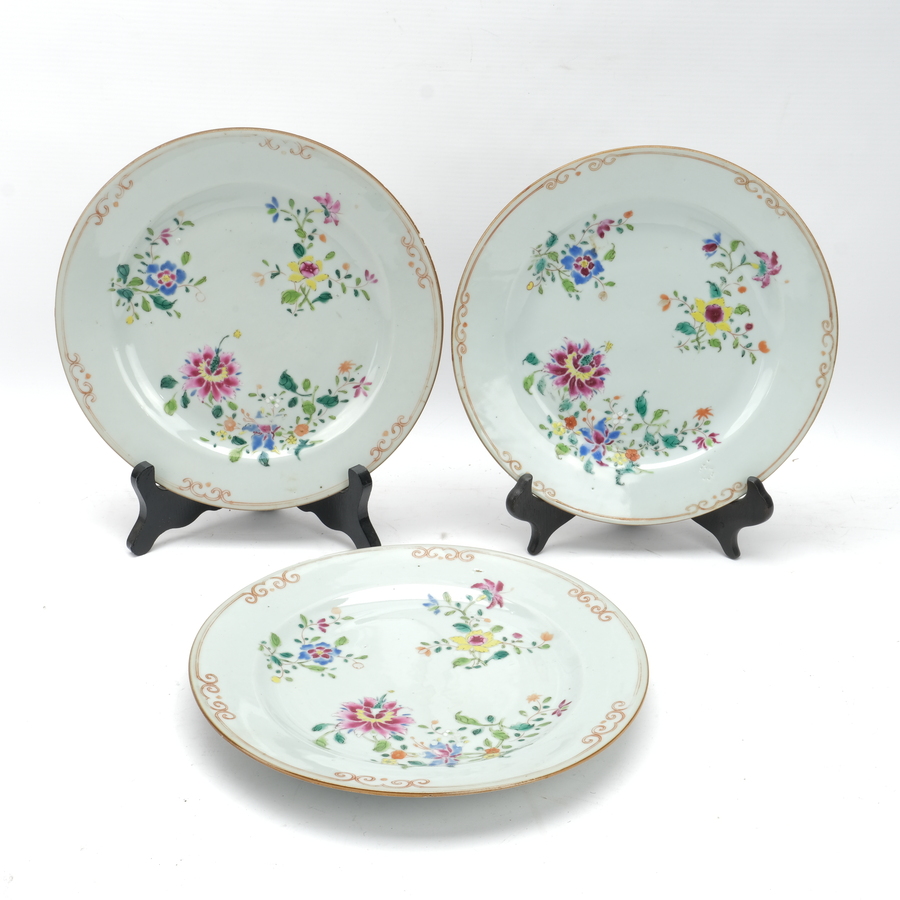 Lot van drie antieke 18e eeuwse Chinees porseleinen borden, Qianlong periode (1735-1796), met Famille Rose decor van bloemen, waaronder pioenrozen en rode randdecoratie.