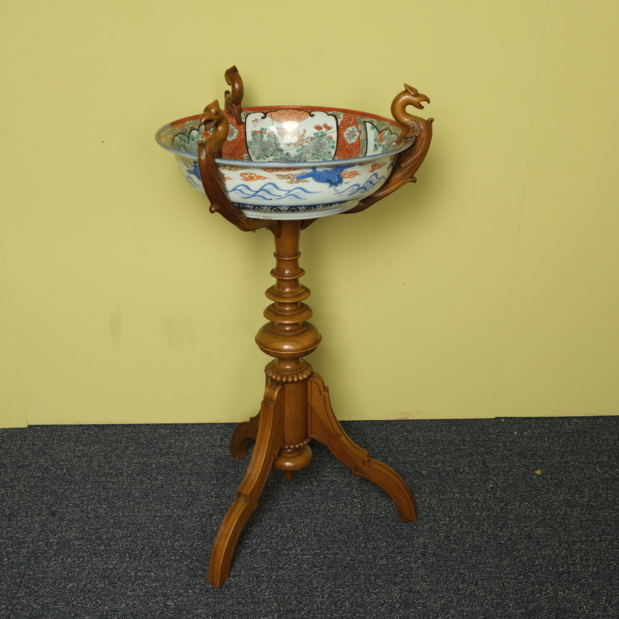 Een antieke 19e eeuwse Japanse schaal op 19e eeuwse Franse houten standaard.