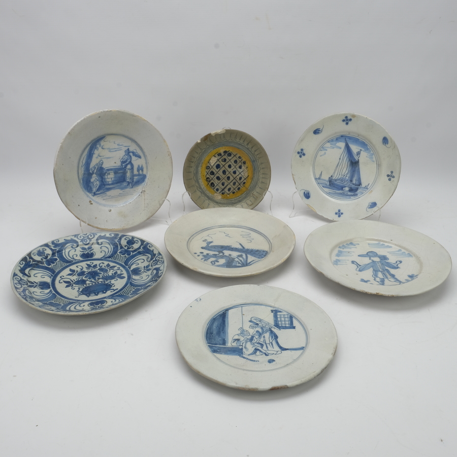 Lot van zeven bodemvondsten, aardewerk. 17e en 18e eeuw. Met restauraties