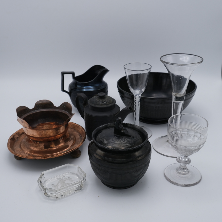 Lot diversen, waaronder een 18e eeuws basaltware theepotje (deksel gekramd), onderdelen van een vroeg 19e eeuws rouwserviesje, een roodkoperen pijpkomfoor en een slingerglas.