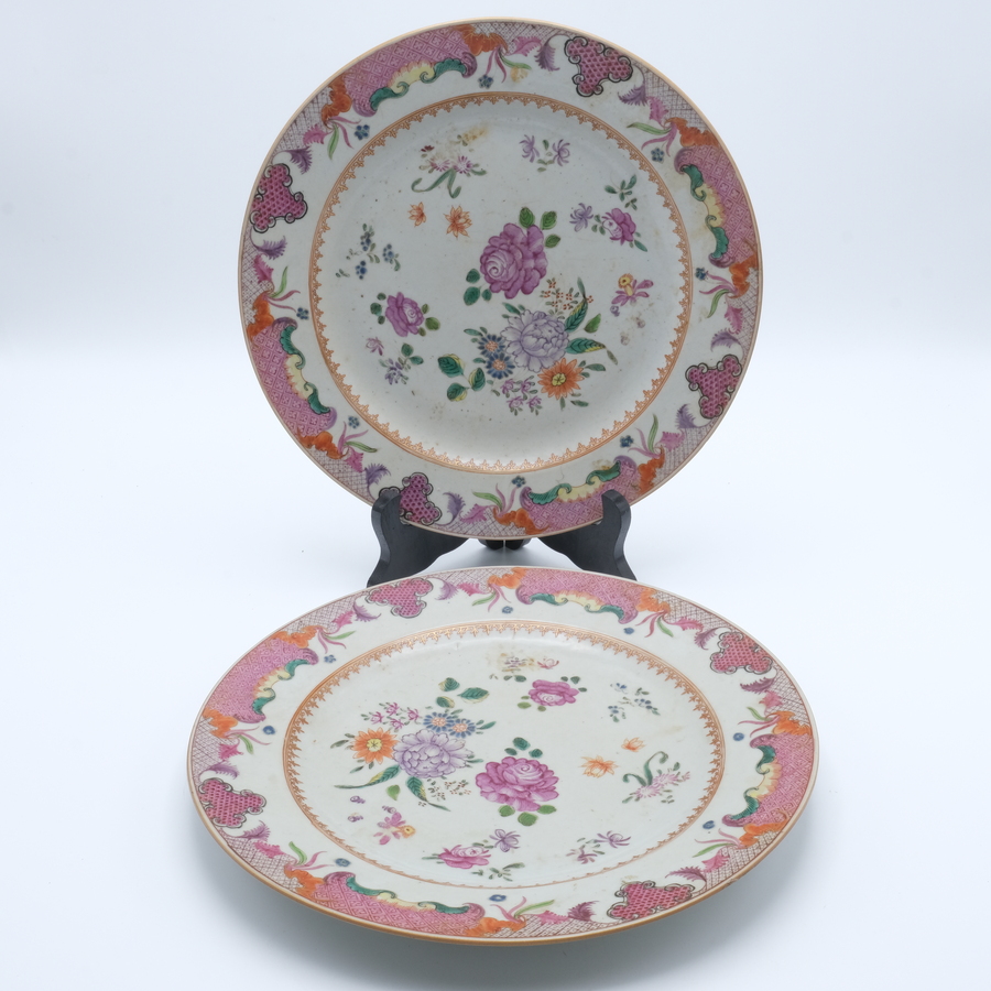 Twee indentieke 18e eeuwse Chinees porseleinen Famille rose schotels. Met servetwerk op de randen en florale motieven op het plat.Naar een Europees voorbeeld.