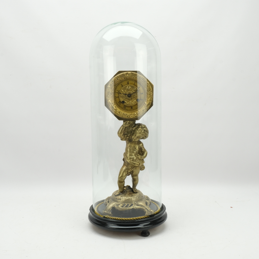 Een antieke bronzen pendule, achtkantig verguld uurwerk met slinger, ca. 1830-1840, gedragen door een gegoten bronzen putti. Vermoedelijk een marriage, het geheel onder een stolp.