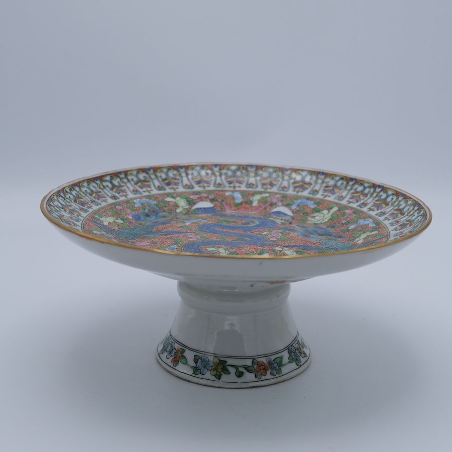 Een antieke Chinees porseleinen Kantonese tazza, schotel op hoge voet. Polychroom fijn beschilderd met een draak en twee feniksen, 19e eeuws