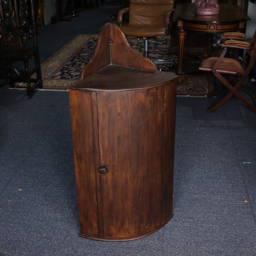 Een antiek 19e eeuws houten hoekkastje met roodbeschilderd interieur met drie planken
