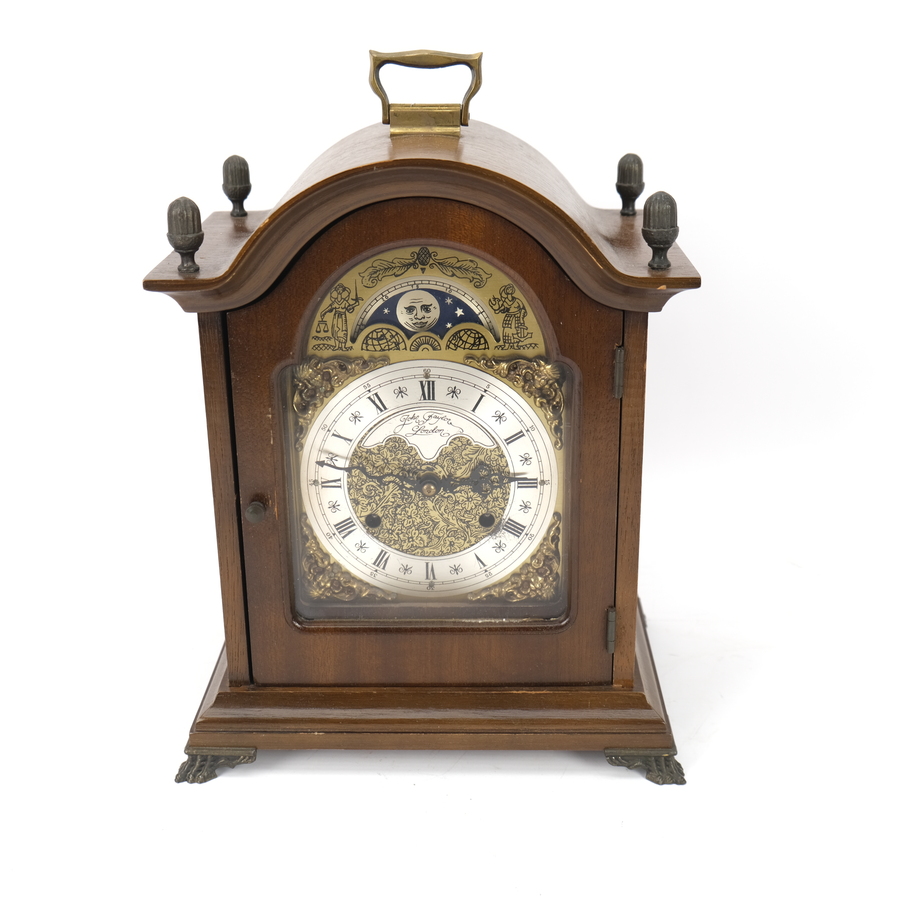 Een Engelse tafelklok met slagwerk naar een antiek model. In mahonie gefineerde kast. Met messing pootjes en aplicaties. Loopt goed.