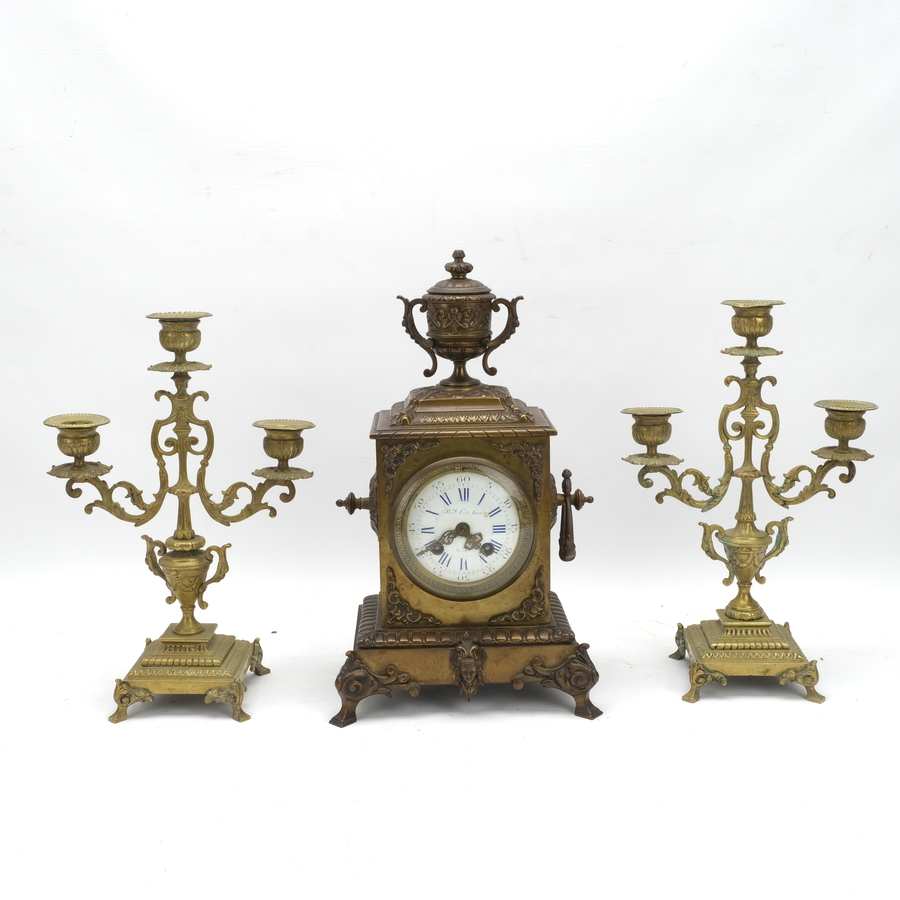 Een antieke 19e eeuwse bronzen kandelaars met urnvormige bekroning, wijzerplaat met opschrift ' B.F.B. de Baas Breda. Met daarbij twee bronzen driearms kandelaars