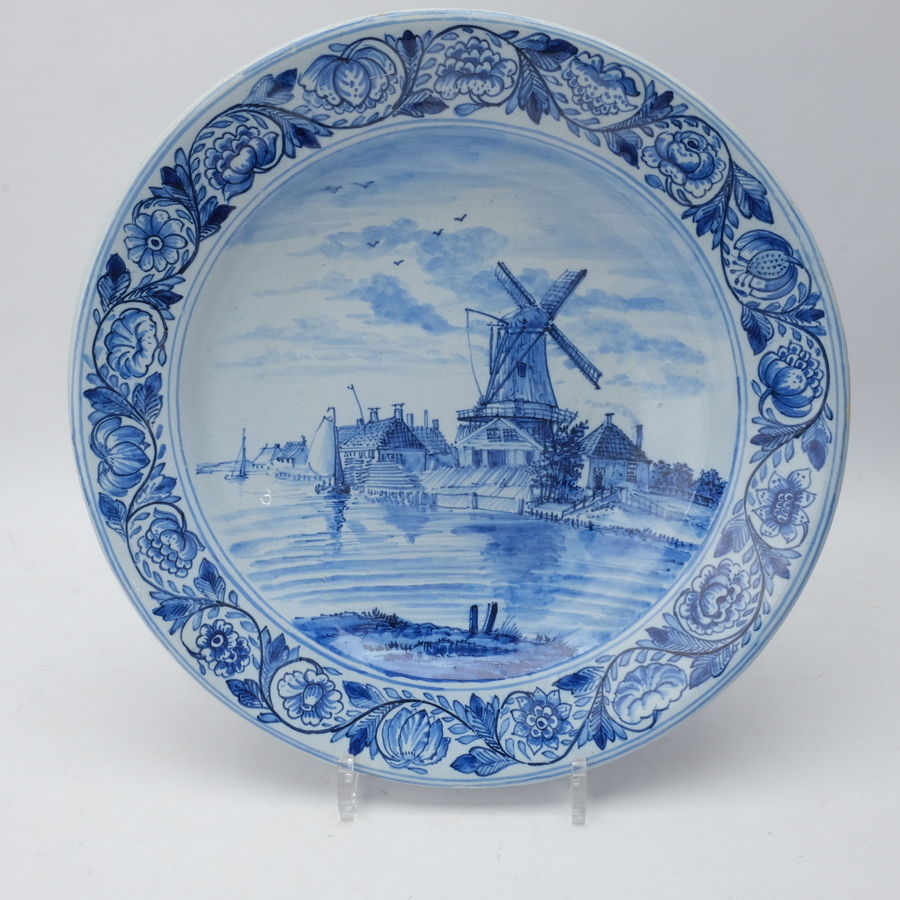 Tichelaar schotel, 33 cm. Ca. 1900. Landschapsdecor met houtzaagmolgen. Schilder Y. Wykstra