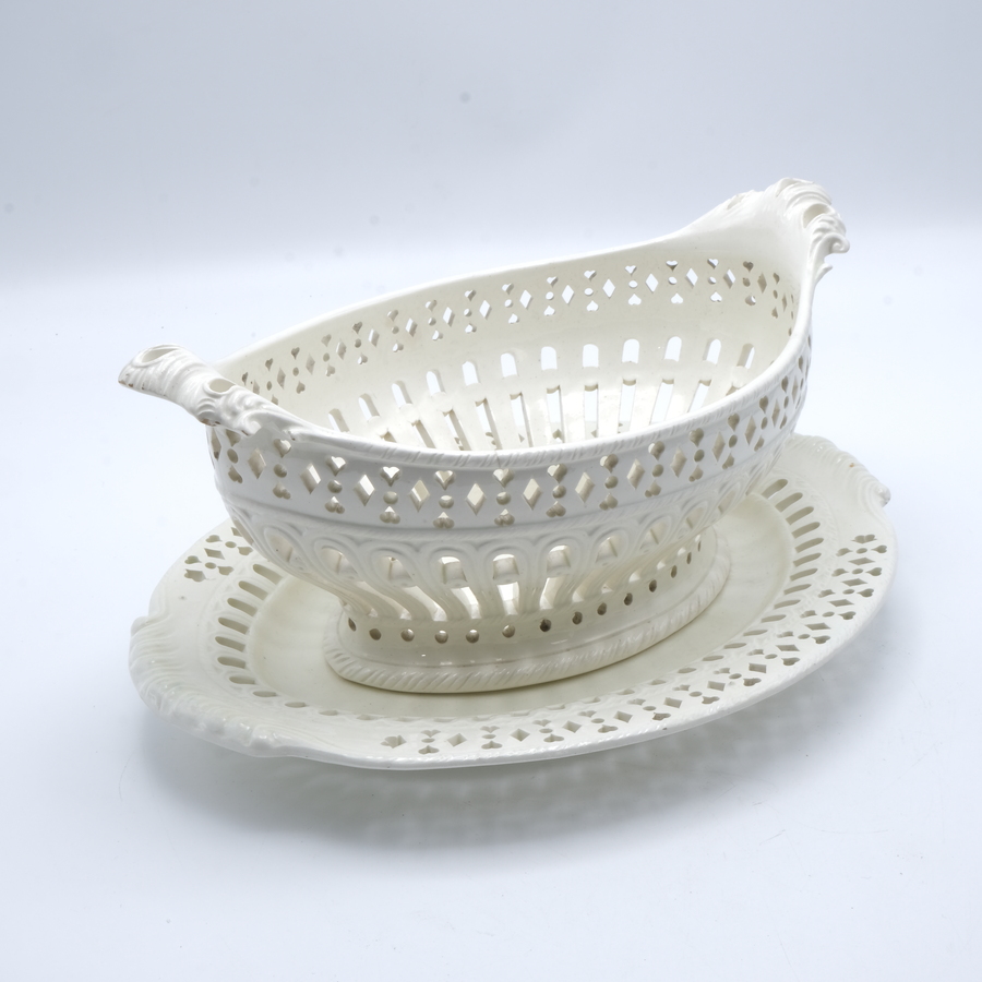 Een Engels laat 18e eeuws opengewerkt creamware mandje met onderschotel