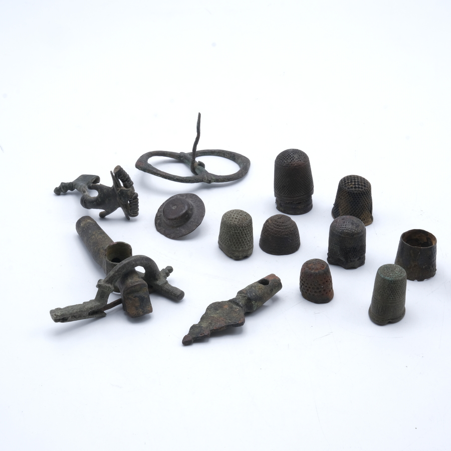 Lot diverse metalen bodemvondsten, waaronder vingerhoedsjes, fibula’s etc