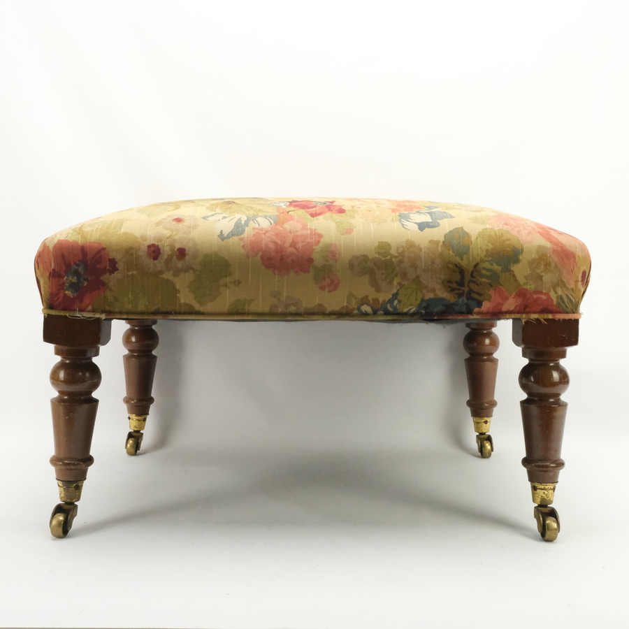 Een Engels tabouretje met stoffen zitting en koperen wieltjes.