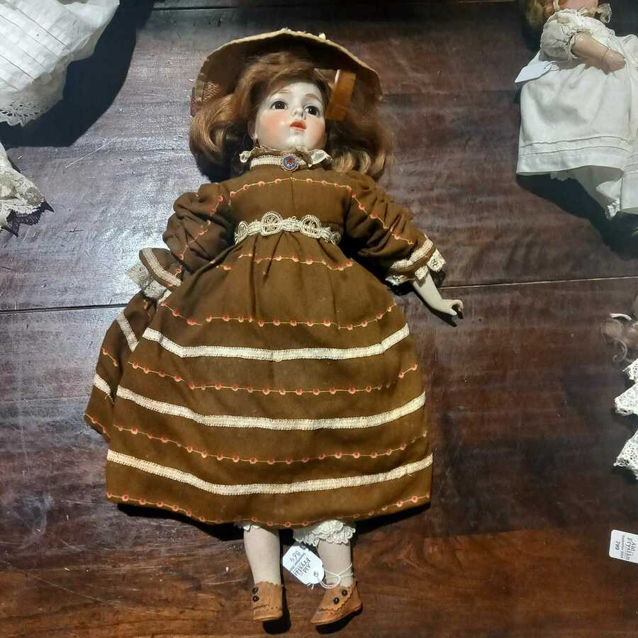 Een pop met stoffen lijf, porseleinen armen, benen en hoofd met gesloten mond. Voorzien van glazen ogen en licht bruin haar. Gemerk Bru (betreft een replica). Gekleed.