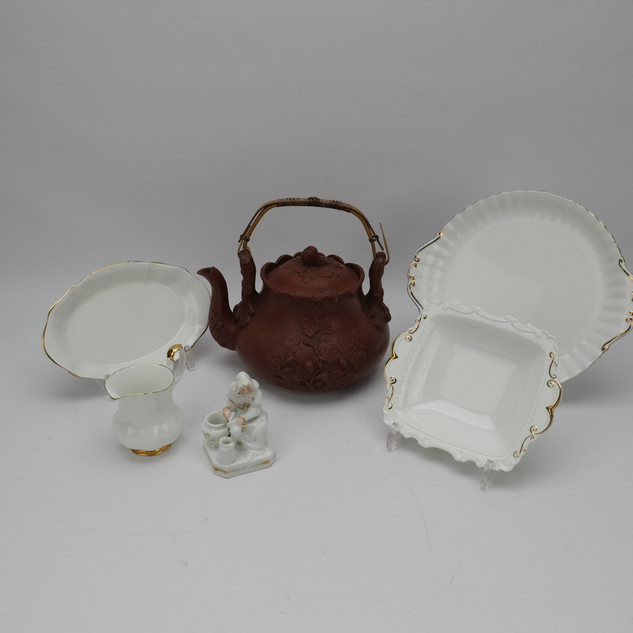 Lot divers aardewerk en porselein: een 19e eeuws porseleinen sculptuur van een vrouw met kan, een Duits aardewerken chocoladekan, gemerkt Wilhelm Schiller, en vier serviesdelen, Royal Albert Val...