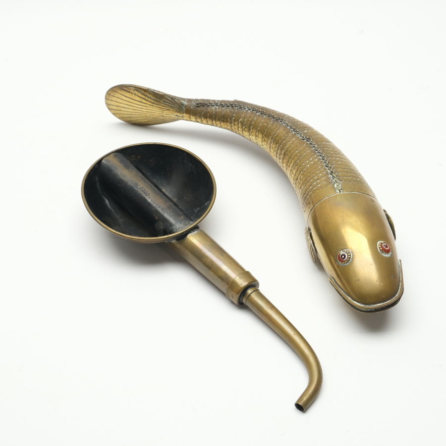 Lot van twee stuks koper: een beweegbare vis en een oorschelp