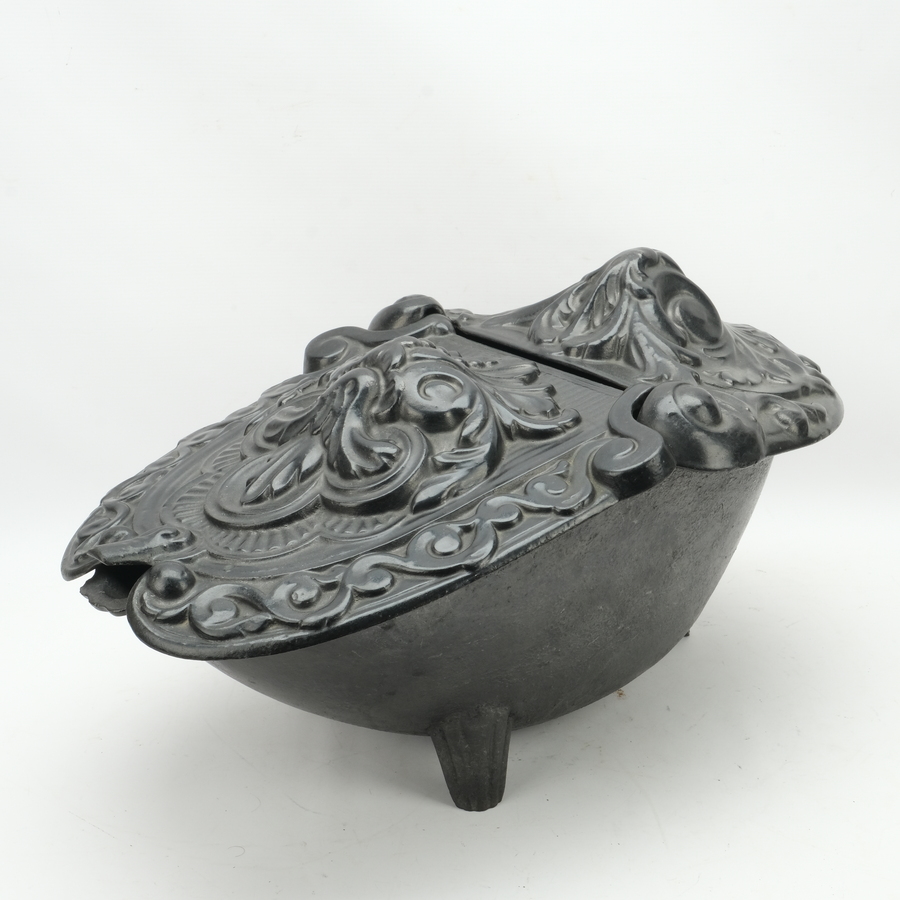 Een antieke laat 19e eeuwse zwarte gietijzeren kolenbak op drie pootjes