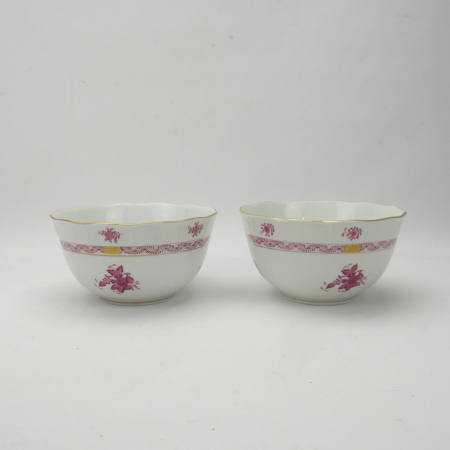 Twee porseleinen kastkommen met een bietenrood floraal decor. Patroon Apponyi. Gemerkt Herend Hungary.