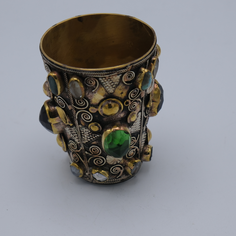Wijnbeker bezet met edelstenen en Chinese tekens.
