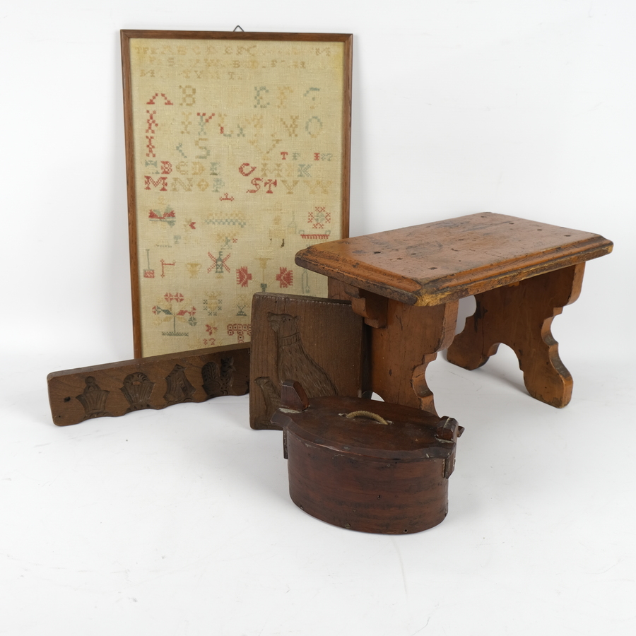 Lot diverse volkskunst: een vroeg 19e eeuwse merk- of letterlap, gedateerd 1826, een miniatuur butte, een 19e eeuws kerkvoetenbankje en twee antieke speculaasvormen.