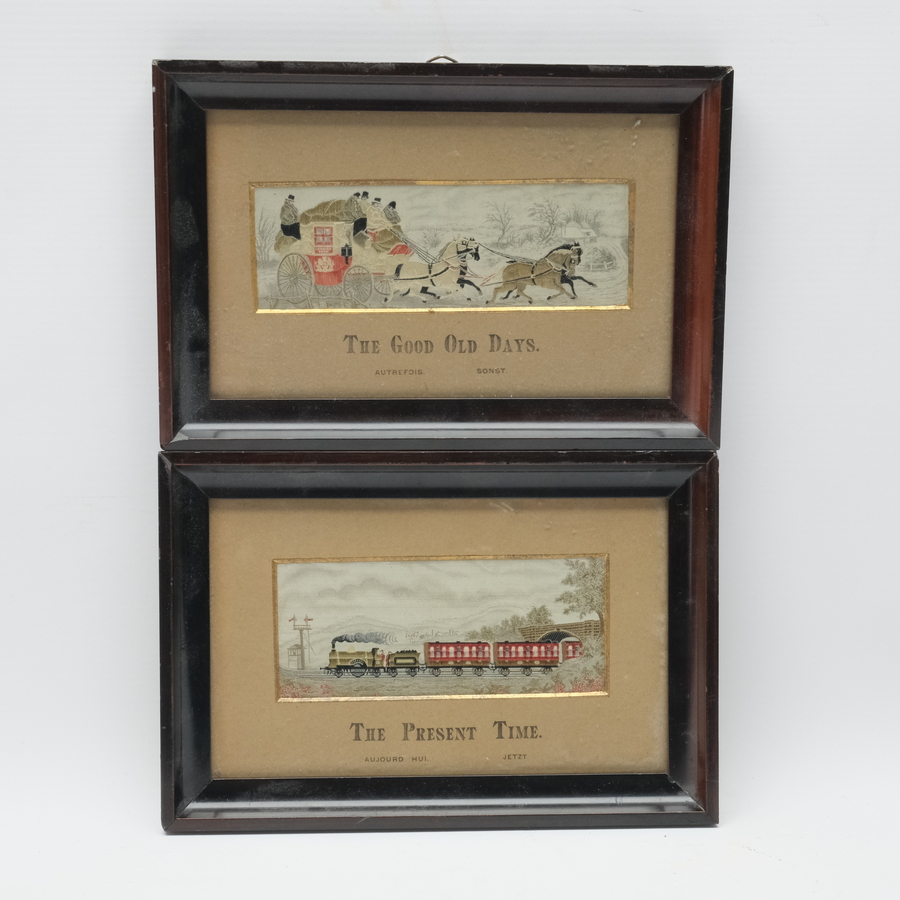 Lot van twee laat 19e eeuwse machinale borduurwerkjes, zgn. 'stevengraphs'. Voorstelling van een koets ('The Good Old Days') en een trein ('The Present Time)