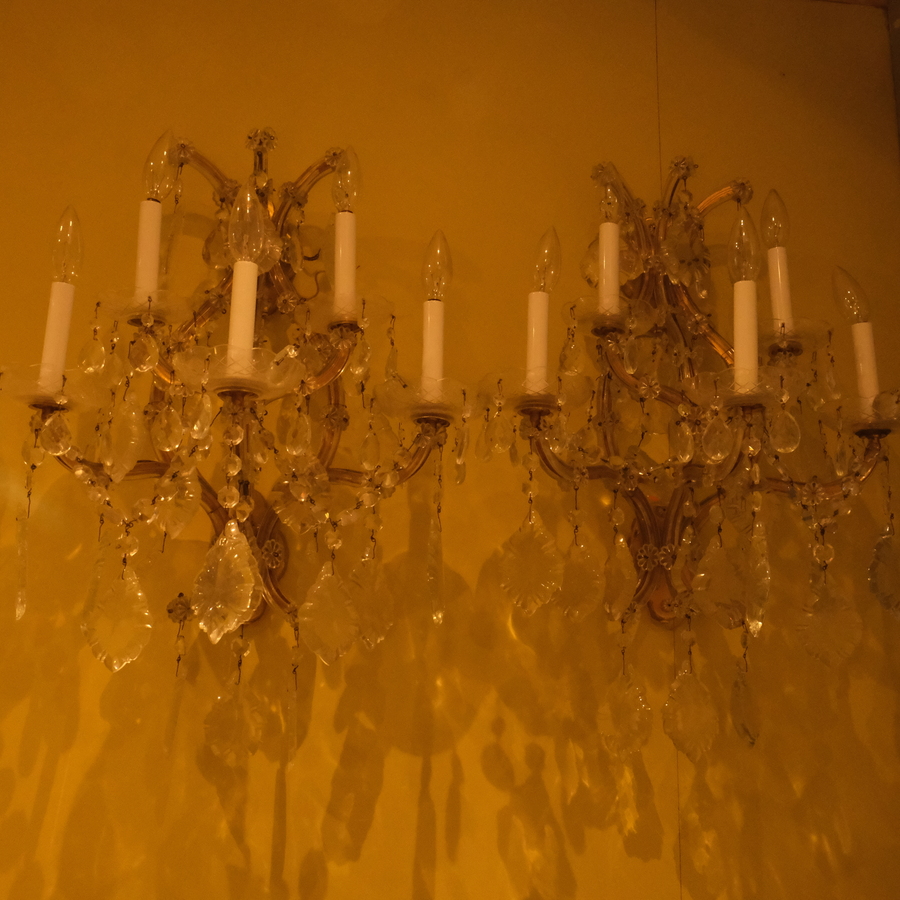 Twee 20e eeuwse kristallen wandlampen met elk vijf lichtpunten en grote pegels
