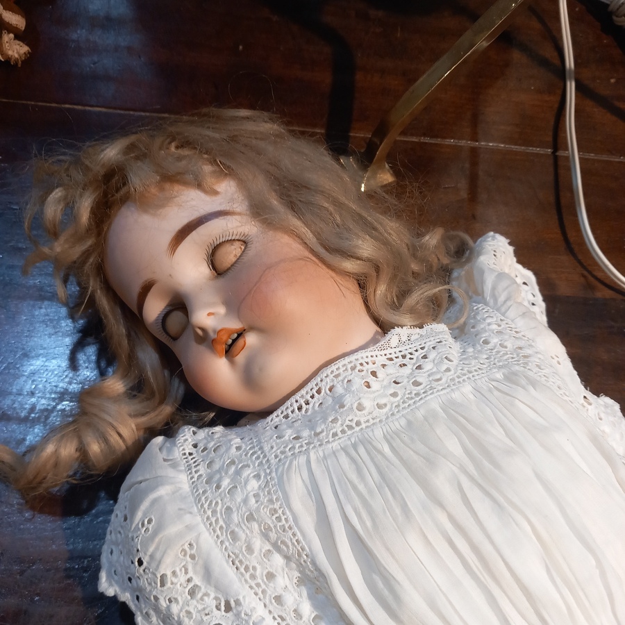 Een antieke pop met papiermaché armen en benen. Voorzien van een porseleinen hoofd. Gemerkt Kresner nr. 112