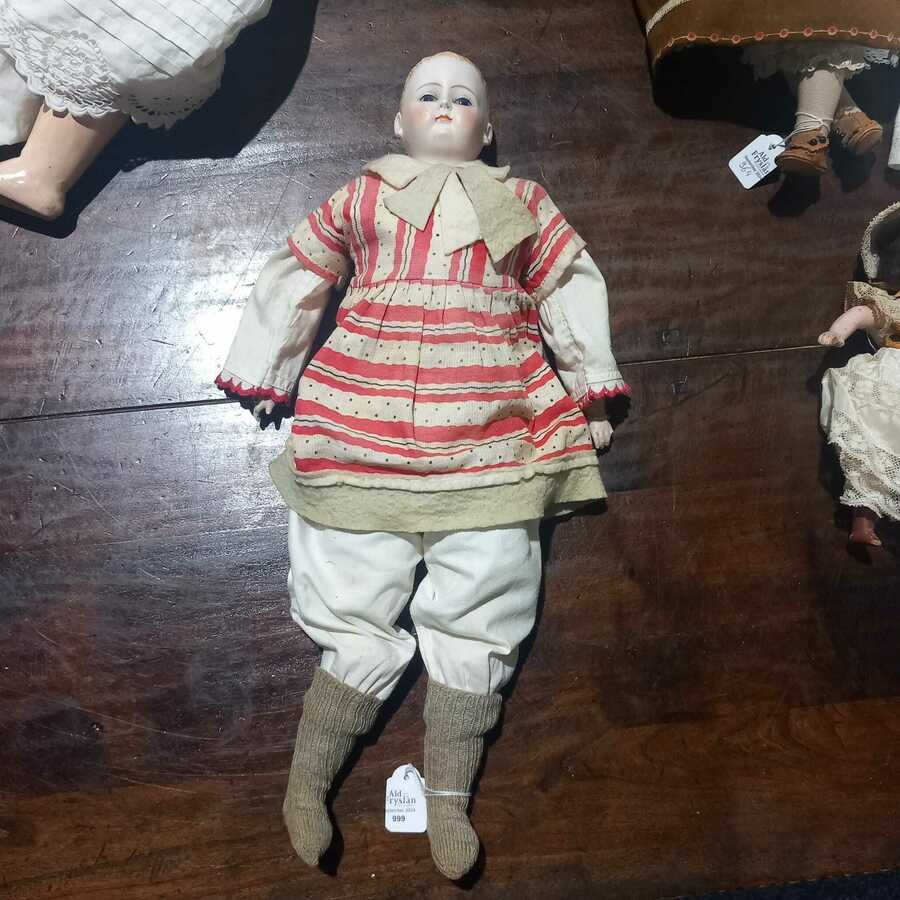 Een antieke Duitse jongenspop met porseleinen armen, benen en hoofd. Gekleed.