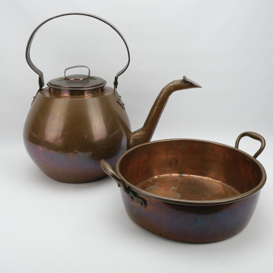 Lot van twee stuks koper: een grote antieke appelketel en een koperen schaal.
