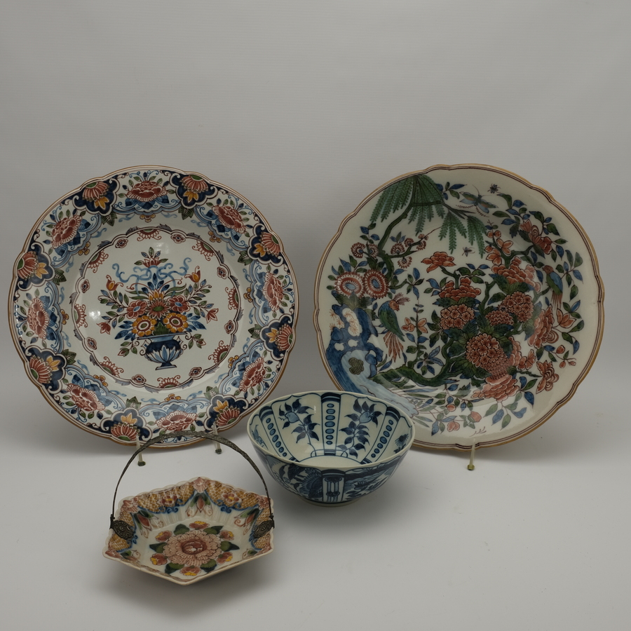Lot van vier stuks aardewerk, allen gemerkt Tichelaar Makkum: twee grote polychroom gedecoreerde wandborden, een blauw-witte kraaikom en een zeskantig schaaltje met tweede gehalte (835/1000) zil...