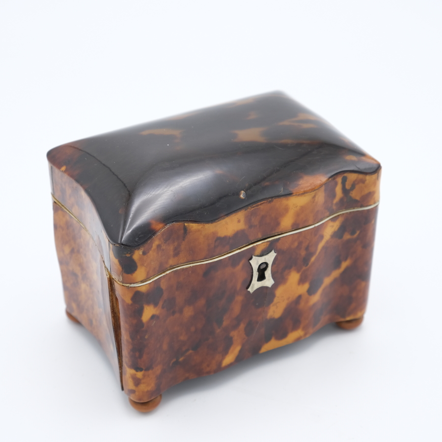 Een antiek 19e eeuws schildpad theekistje met bolvormige deksel en binnendeksel, geplaatst op bolpootjes.