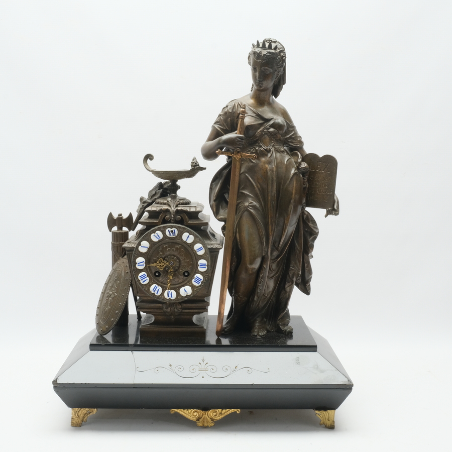 Een antieke 19e eeuwse Franse metalen pendule op marmeren basement met vergulde pootjes. Voorstelling van een vrouw met zwaard naast sierurn (Allegorie van het Recht), met in haar andere hand ee...