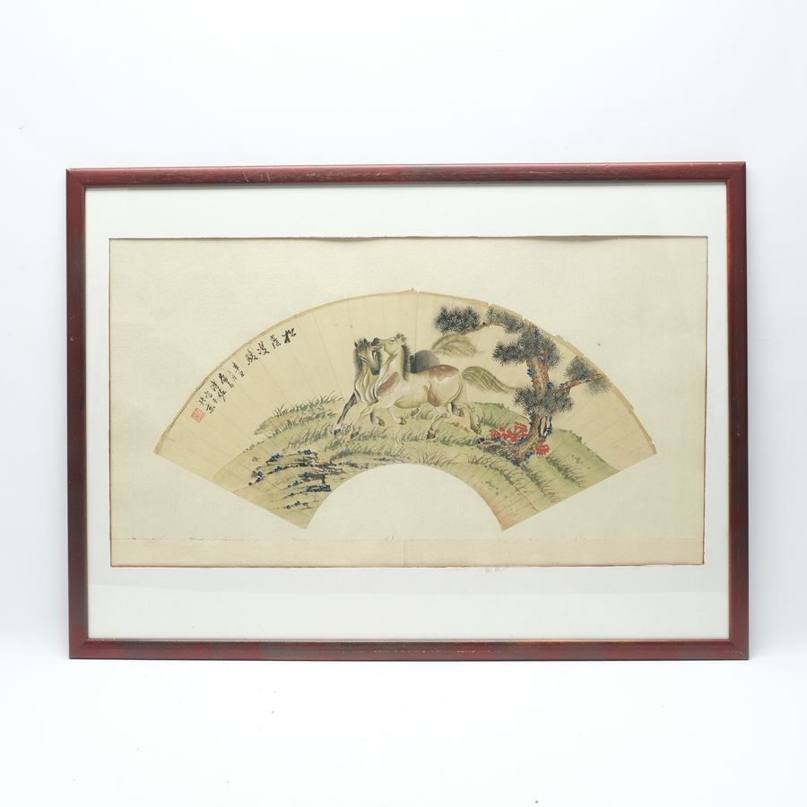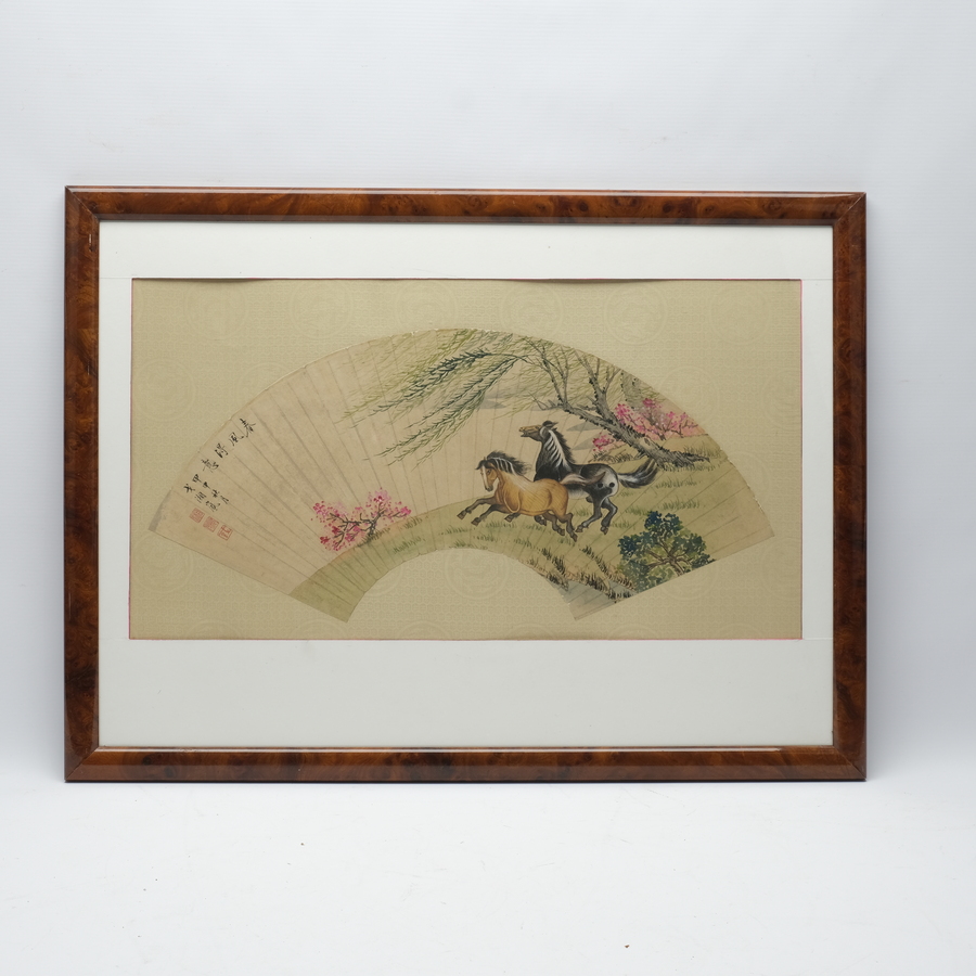 Een vroeg 20e eeuwse Chinese beschilderde waaier in lijst, voorstelling van twee paarden. Gemerkt met Chinese karakters en zegelmerken