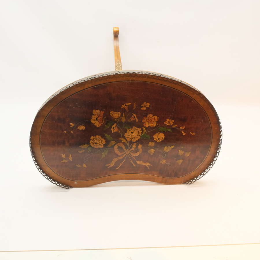 Een antiek vroeg 20e eeuws niervormig bijzettafeltje met intarsia ingelegd blad, voorstelling van bloemen en strikmotief, en koperen rand. Op driepoots voet. Op de onderzijde gemerkt 'Made in Gr...