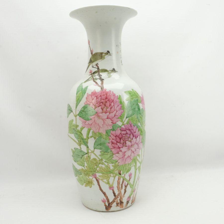 Een Chinees porseleinen vaas. Voorzien een decor van polychroom pioenrozen, twee vogels op takken en teksten. Vroeg 20e eeuws.