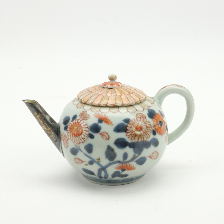 Een 18e eeuws Japans Imari trekpotje, Edo periode, met onderglazuur blauw en bovenglazuur rood en goud decor van bloemen, met reliëf, met bloemvormige knop. Tuit gerestaureerd met zilveren montu...