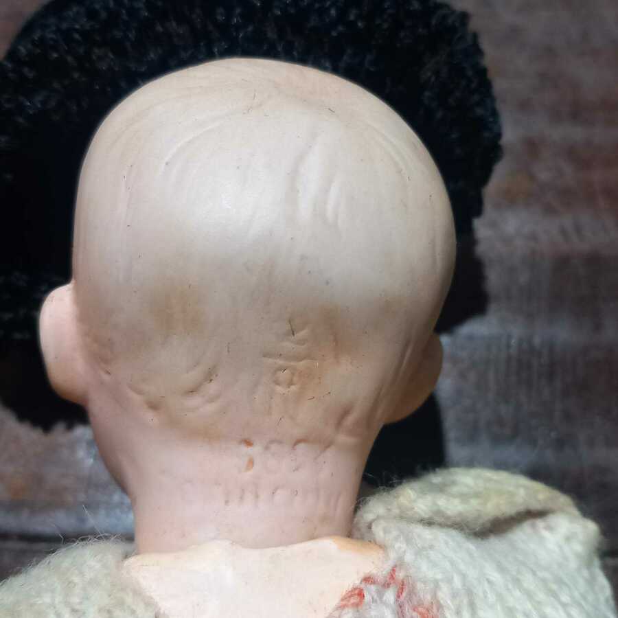 Een antieke baby pop met papiermaché armen en benen. Een porseleinen hoofd, gemerkt op het achterhoofd