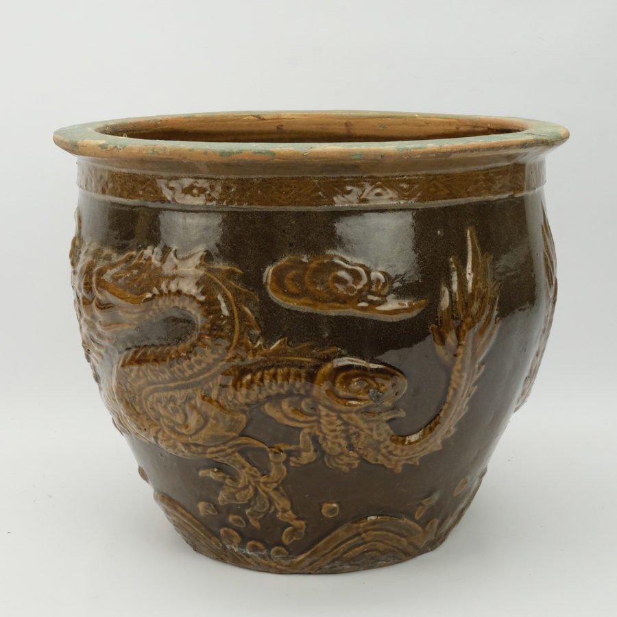 Een 20e eeuwse Chinese bruin aardewerken jardiniere met reliëf decor van draken