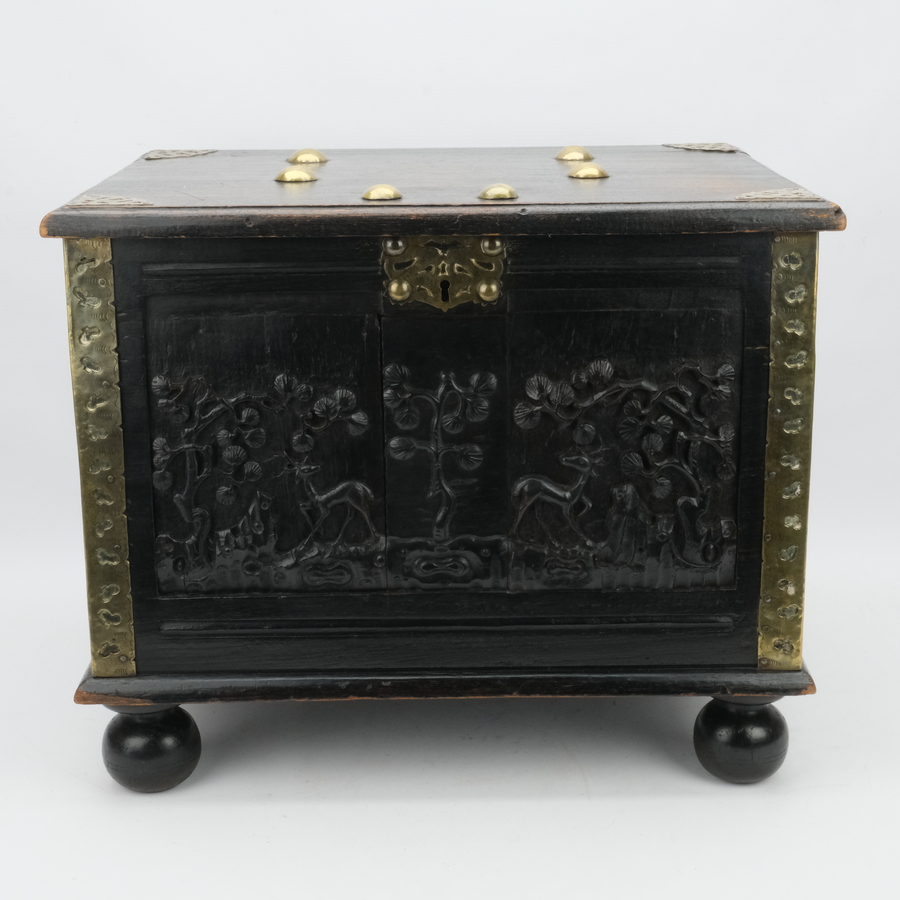 Een antieke 19e eeuwse Indonesische koloniale hardhouten kist met koperen beslag en steekwerk van herten bij bomen op de voorkant. Met twee grepen aan de zijkant, geplaatst op bolpoten.