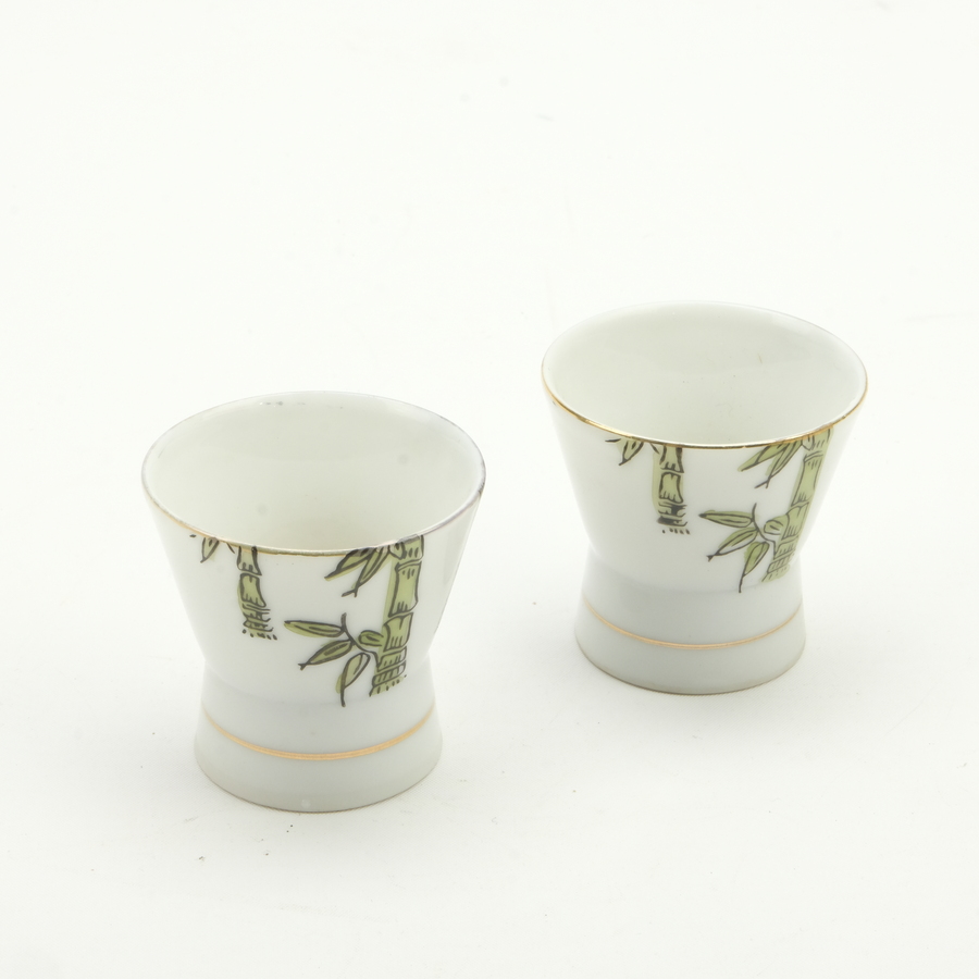 Lot van twee 20e eeuwse Japanse rijstewijnkopjes met bamboedecor aan de buitenkant en erotische voorstelling onder bolglas aan de binnenkant