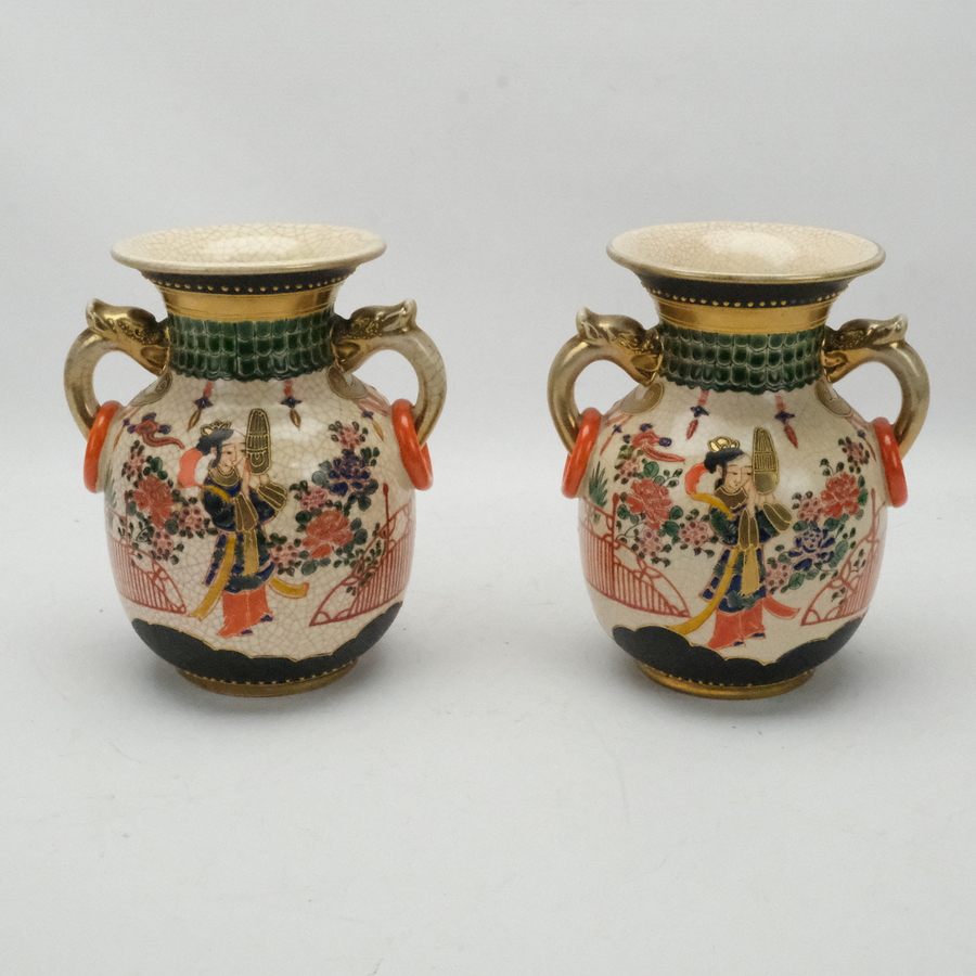 Lot van twee 20e eeuwse Japanse aardewerken satsuma tweeorenvazen met beschilderd decor van figuren