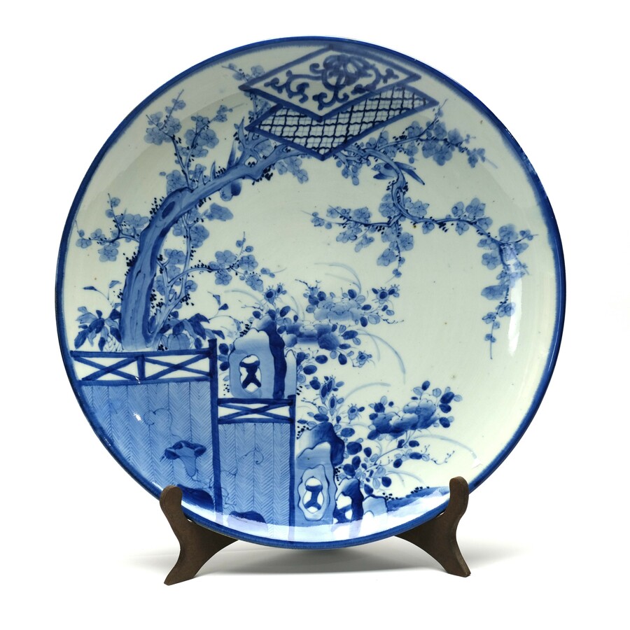 Een antieke laat 19e eeuwse Japanse blauw-witte schotel met decor van rotsen een boom in bloesem.