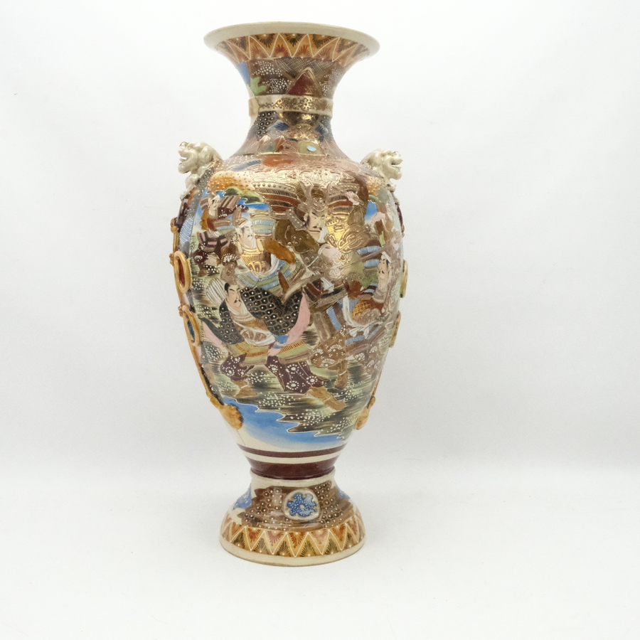 Een grote 20e eeuwse Japanse satsuma vaas, rijk gedecoreerd met o.a. figuren. Aan de zijkant twee leeuwenkoppen.