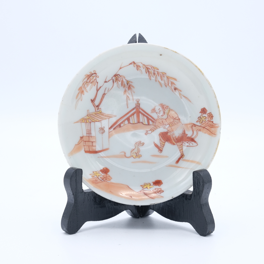 Een vroeg 18e eeuws Chinees porseleinen schoteltje met melk en bloed decor van man met hond. Kangxi of Yongzheng periode